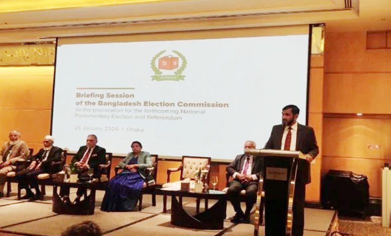 Staff Reporter: The Election Commission (EC) today held a meeting with foreign diplomats stationed in Bangladesh to brief them on preparations for the upcoming national parliamentary election and referendum.